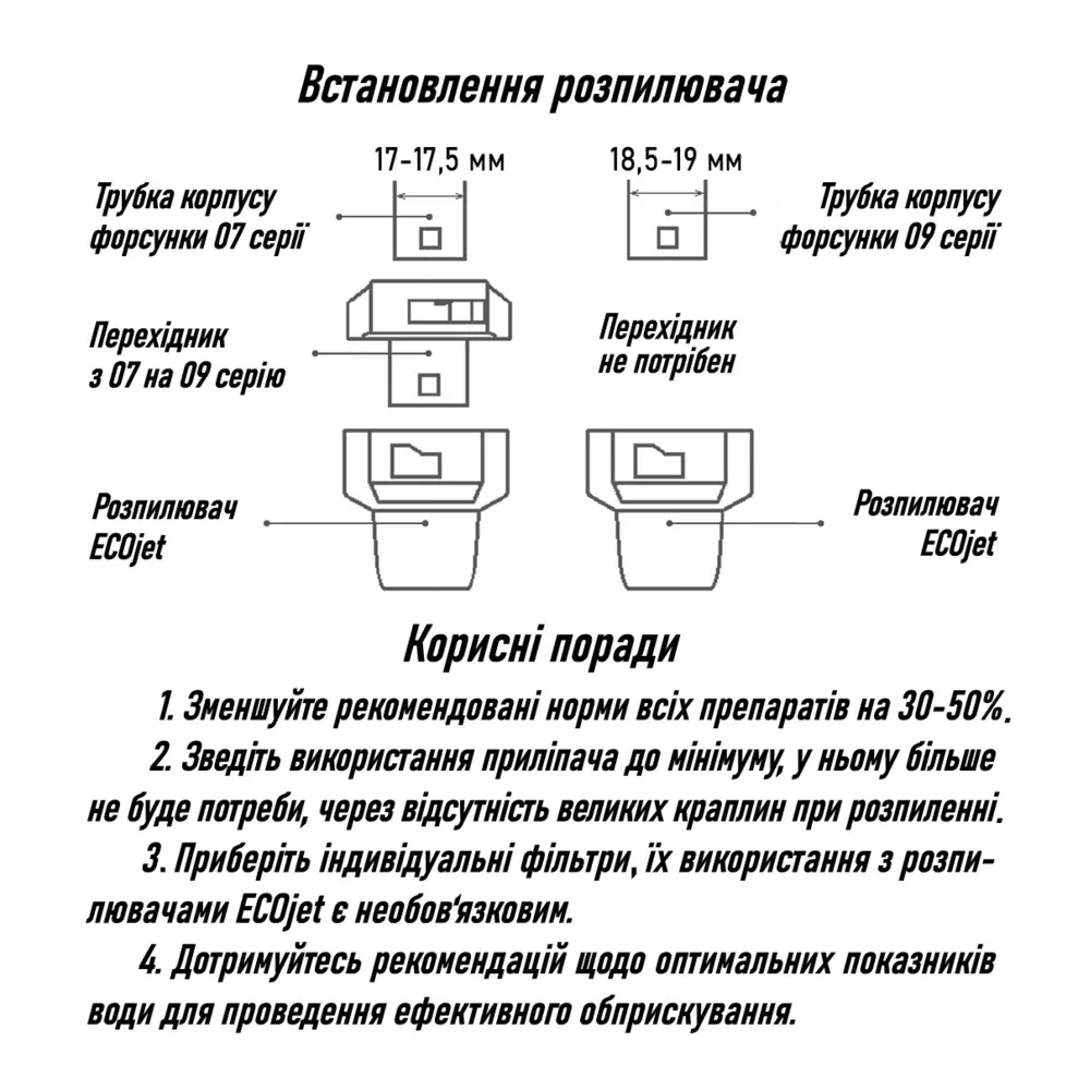 Відцентрові розпилювачі ECOjet створюють 90º конусну модель розпилення з дрібним розміром крапель і примусовим осадженням робочої рідини на поверхню рослини. Ці розпилювачі ідеально підходять для роботи на навісних, причіпних і самохідних обприскувачах за всіма видами с/г культур. Дрібний розмір крапель, краще проникнення в густу масу рослини і рівномірне покриття листя більш ніж на 80% робить цей розпилювач ідеальним інструментом для внесення інсектицидів, фунгіцидів, листових добрив та інших ЗЗР.