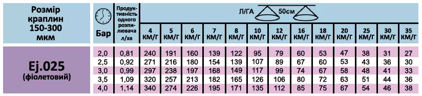 Можливість працювати нормою виливу від 100 до 150 л/га при робочому тиску від 2-х до 4-х атм. і швидкості руху 8-10 км/г за рахунок дрібної краплі і покриття більше 80% загальної площі рослини. Для роботи на більш високих швидкостях дивіться норми виливу в таблиці.