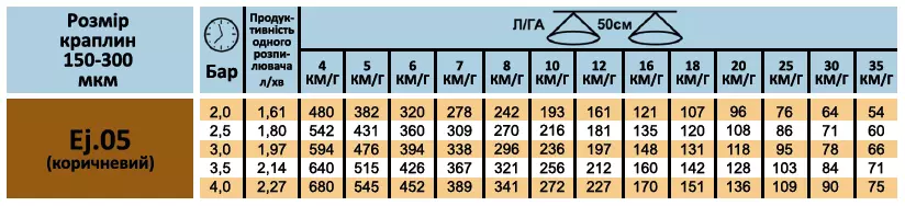 Можливість працювати нормою виливу від 200 до 300 л./га. при робочому тиску від 2-х до 4-х атм. і швидкості руху 8-10 км/г за рахунок дрібної краплі і покриття більше 80% загальної площі рослини. Для роботи на більш високих швидкостях дивіться норми виливу в таблиці.